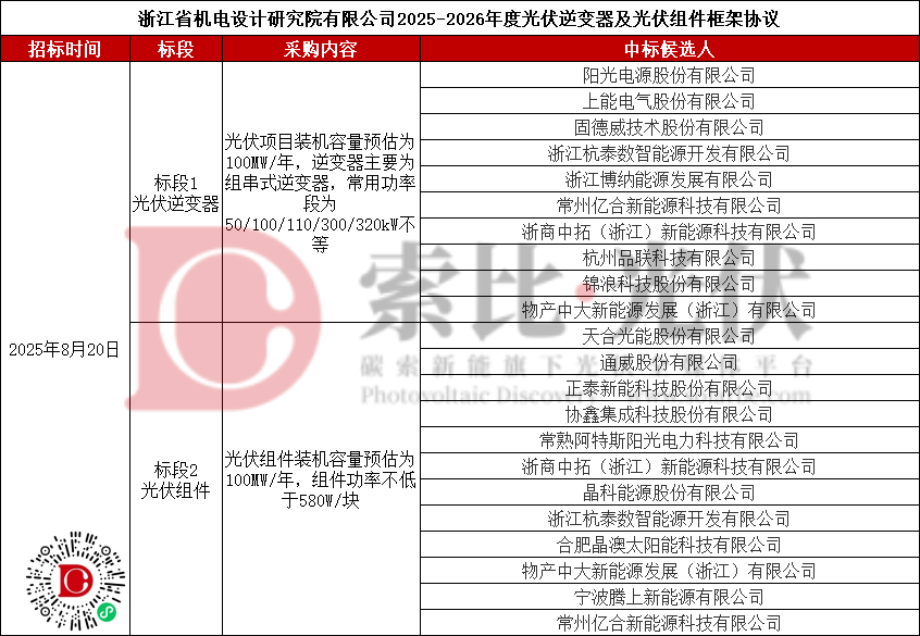 9月15日,浙江省机电设计研究院有限公司2025-2026年度光伏逆变器及光伏组件框架协议成交结果公示。项目规模暂定合计容量100MW/年。