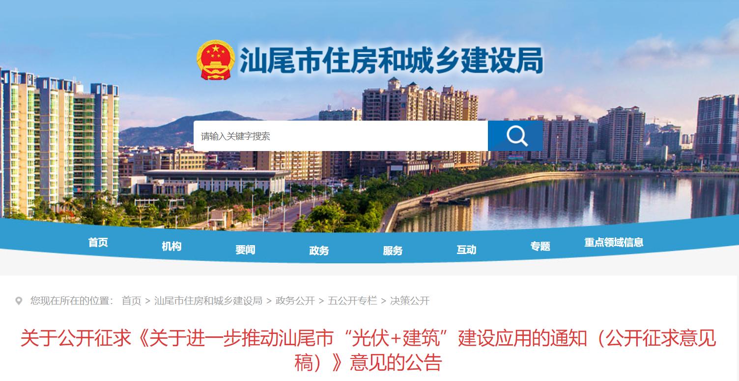 近日,广东汕尾市住房和城乡建设局公开征求《关于进一步推动汕尾市“光伏+建筑”建设应用的通知(公开征求意见稿)》意见的公告。
