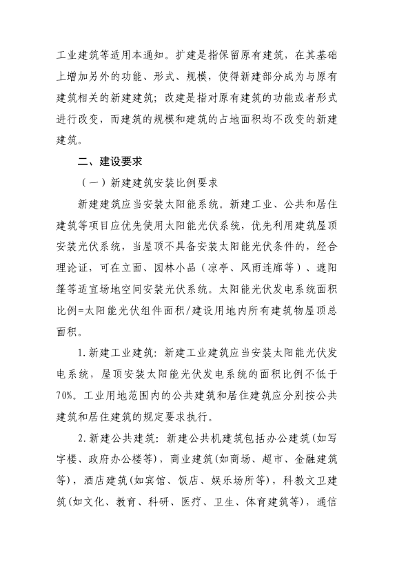 1.新建工业建筑:新建工业建筑应当安装太阳能光伏发电系统,屋顶安装太阳能光伏发电系统的面积比例不低于70%。工业用地范围内的公共建筑和居住建筑应分别按公共建筑和居住建筑的规定要求执行。
