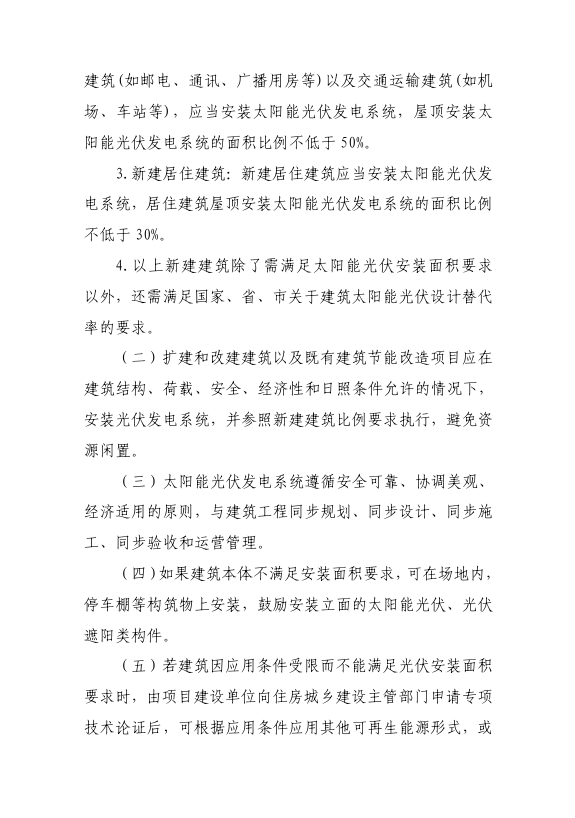 3.新建居住建筑:新建居住建筑应当安装太阳能光伏发电系统,居住建筑屋顶安装太阳能光伏发电系统的面积比例不低于30%。