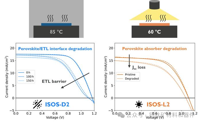 详细分析表明,这种性能损失并非源于钙钛矿本身的变化,而是由于钙钛矿吸收层和电子传输层之间界面处形成的传输势垒。ISOS-L2协议结合了热应力和光照,被证明是最具破坏性的。效率在短短35小时内下降到80%,在这种情况下,钙钛矿吸收层本身显示出明显的结构和光电退化迹象,证实热量在光照下加速离子偏析。