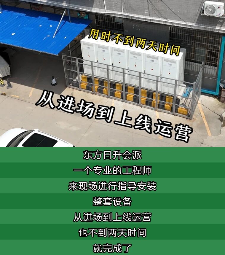东方日升 iCon 工商业液冷储能一体机采用高度集成化设计,集成了BMS、EMS、PCS及SMS,并配备高压箱、配电、空调、PACK与汇流装置,整体占地仅1.4平方米,比传统方案节省约25%的空间。设备出厂时已具备完整配电系统,无需现场组装,实现“一体交付、即装即用”,有效降低安装周期与成本。在此项目中,从设备进场到并网运行,仅用不到两天时间便顺利完成交付。
