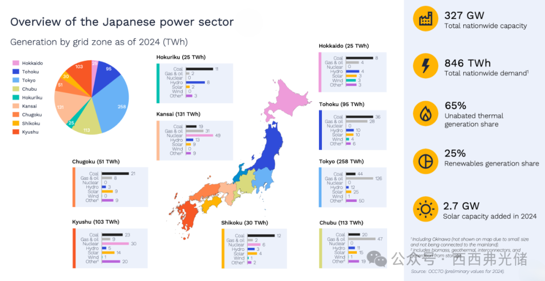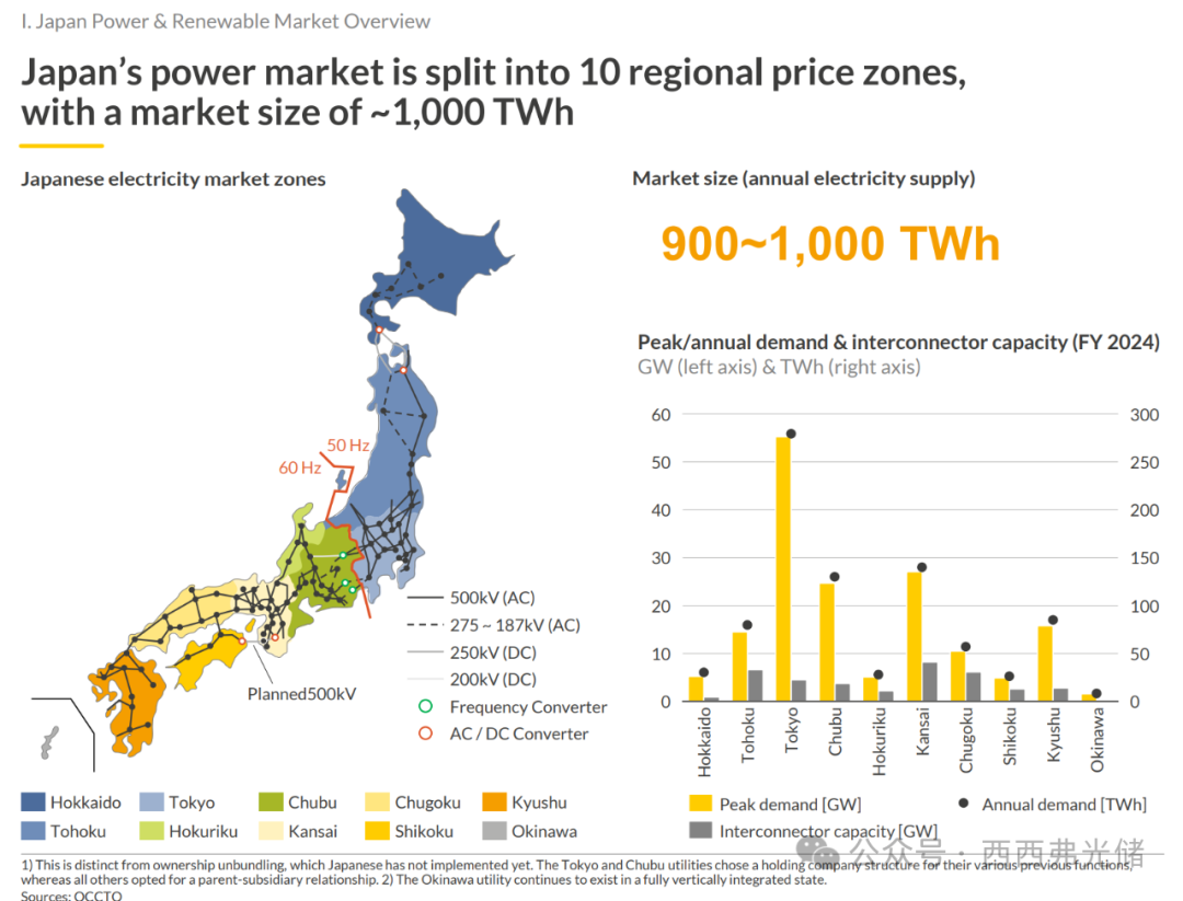 要理解日本的能源转型,首先需要了解其独特的市场结构。日本的电力市场分为10个区域性价格区,且存在两个非同步的电网频率:东部为50赫兹,西部为60赫兹。这个年电力供应量近1,000太瓦时(TWh)的庞大市场,其区域分割和频率差异为可再生能源的全国性调度带来了挑战,也为储能等灵活性资源创造了需求。