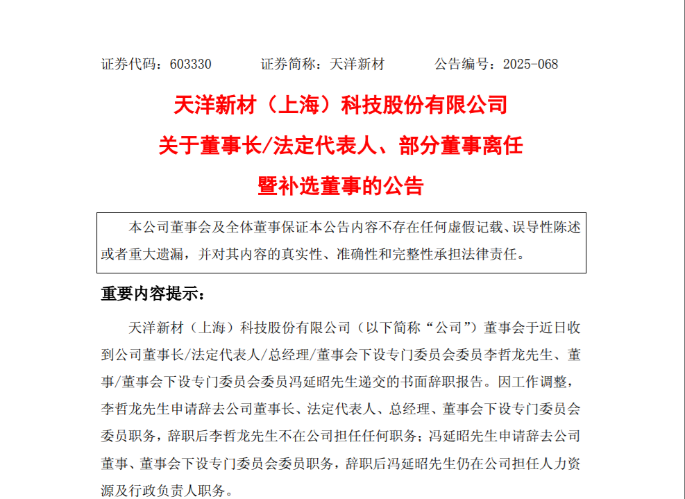 9 月 13 日,天洋新材(603330)发布公告,公司董事长、总经理李哲龙因工作调整辞去所有职务,辞职后不再于公司任职。同日,董事冯延昭辞去公司董事及董事会下设专门委员会委员职务,不过仍保留人力资源及行政负责人职位。