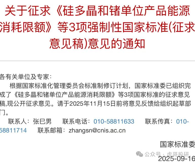 16日,国家标准委发布关于征求《硅多晶和锗单位产品能源消耗限额》等3项强制性国家标准(征求意见稿)意见的通知。征求意见稿于25年11月15日前收集意见,预计年内或有望发布。