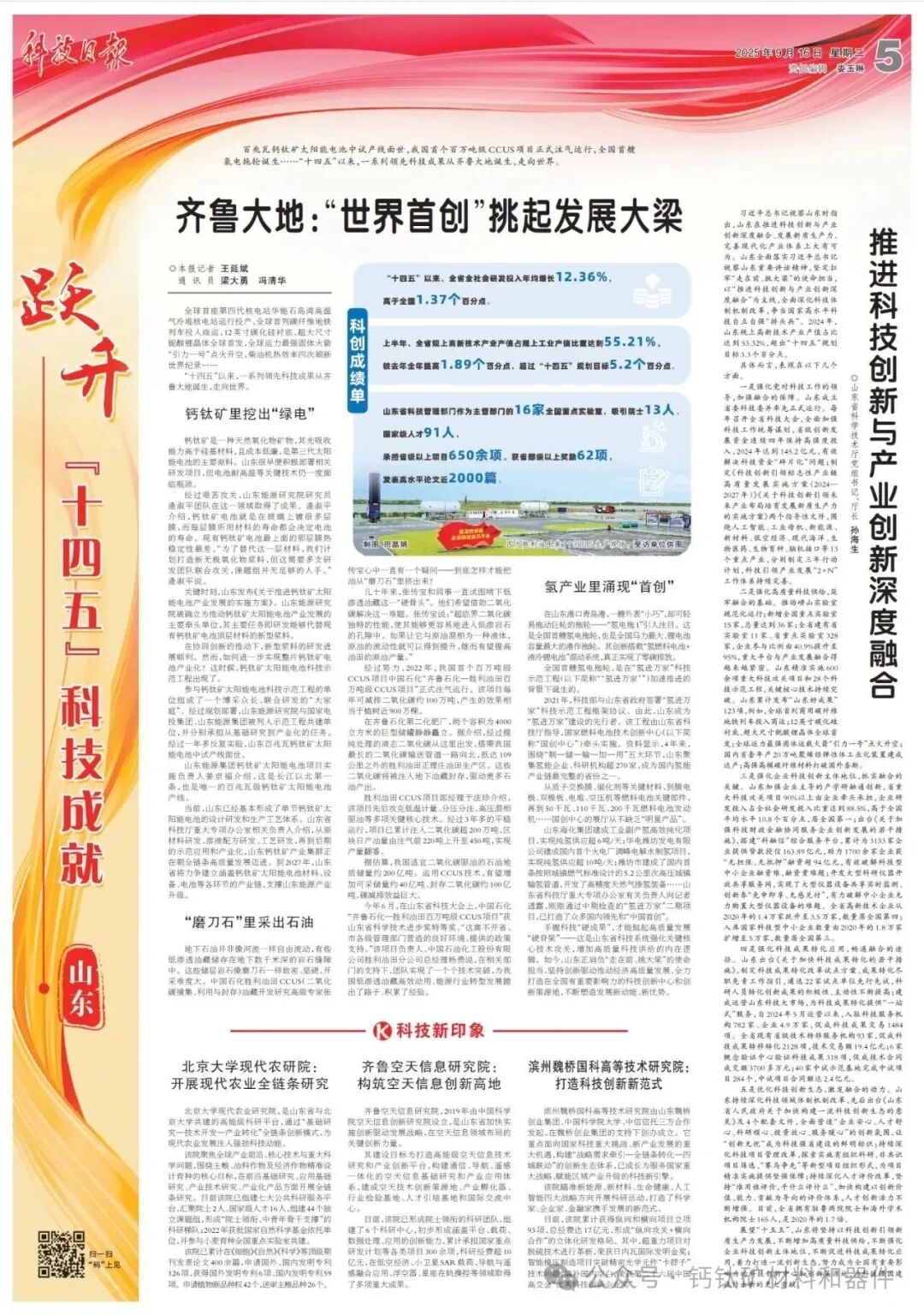 2015 年 9 月 16 日,《科技日报》以整版篇幅聚焦齐鲁大地,重磅推出题为《齐鲁大地:“世界首创” 挑起发展大梁》的深度报道,将目光锁定在山东在新能源技术领域的突破性探索上,其中,“从钙钛矿里挖出‘绿电’” 的创新实践,成为展现山东科技硬实力与产业前瞻性的核心亮点,引发各界广泛关注。