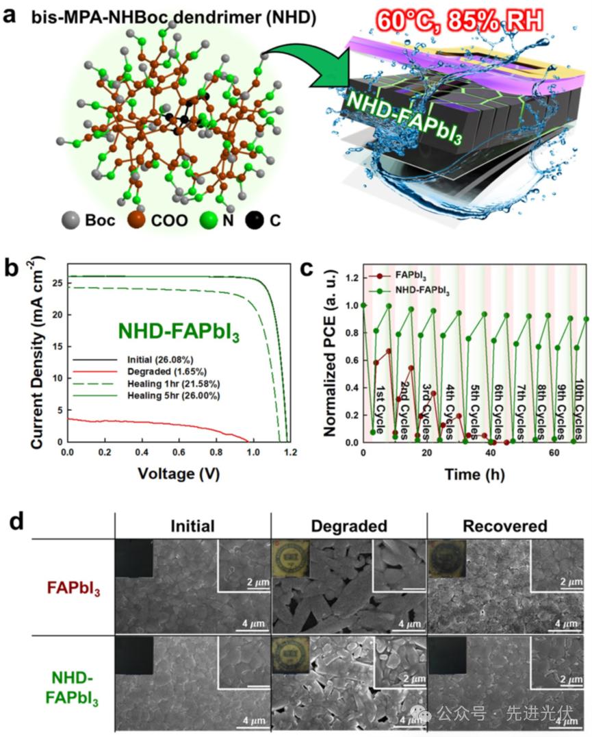 针对钙钛矿太阳能电池(PSCs)在潮湿环境下本征不稳定性导致的性能衰退问题,韩国汉阳大学与高丽大学研究团队创新性地提出利用树枝状大分子(dendrimer)作为挥发性组分储存器,实现钙钛矿材料的可持续自修复。该研究通过设计具有高密度官能团的双亲性树枝状分子(NHD),在钙钛矿成膜过程中引入其作为添加剂,成功实现了对甲酰胺(FA)等挥发性组分的可逆捕获与释放,从而在多次湿度-干燥循环中保持器件性能。基于该策略的PSCs实现了26.2%的认证效率(Voc=1.19 V,Jsc=26.17 mA/cm²,FF=84.21%),并在10次高湿-干燥循环后仍能恢复90%的初始效率,展现出卓越的重复自修复能力。