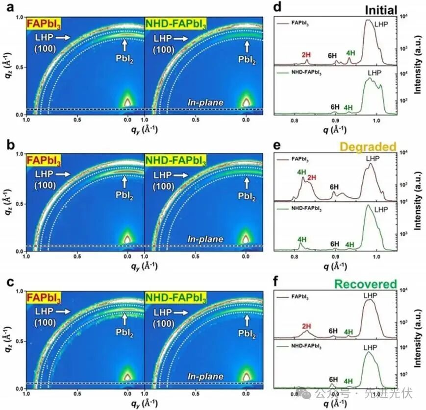 可逆相变机制:在湿度诱导降解过程中,NHD促进中间相(4H/6H)形成,抑制PbI₂完全分解,为自修复提供结构基础。