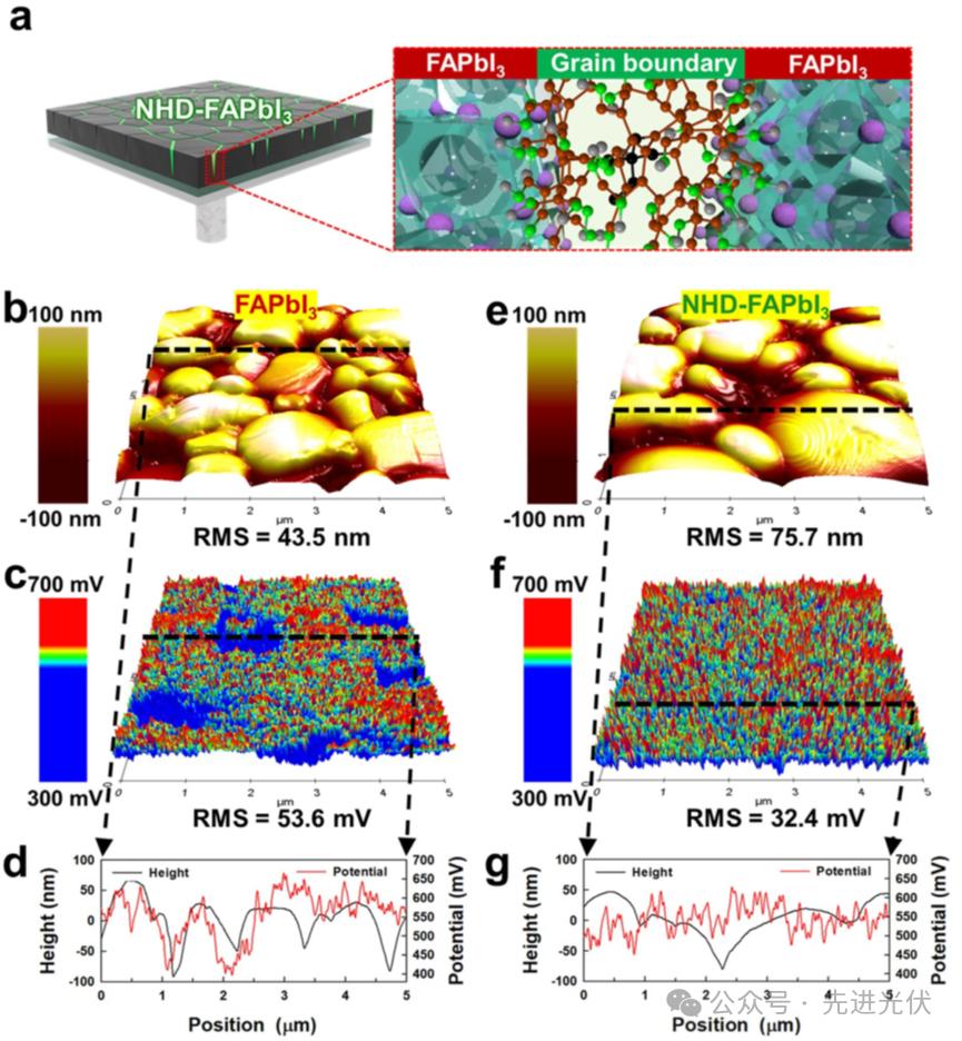 Figure 3结合原子力显微镜(AFM)的表面形貌与表面电势成像,分析了NHD在钙钛矿晶界(GBs)处的分布及其对电荷复合的抑制作用。结果显示,NHD-FAPbI₃薄膜具有更大的晶粒和更均匀的表面电势分布,其均方根粗糙度虽略有增加,但电势波动显著降低,证实NHD有效钝化了晶界处的陷阱态,减少了非辐射复合,从而提升了器件性能。