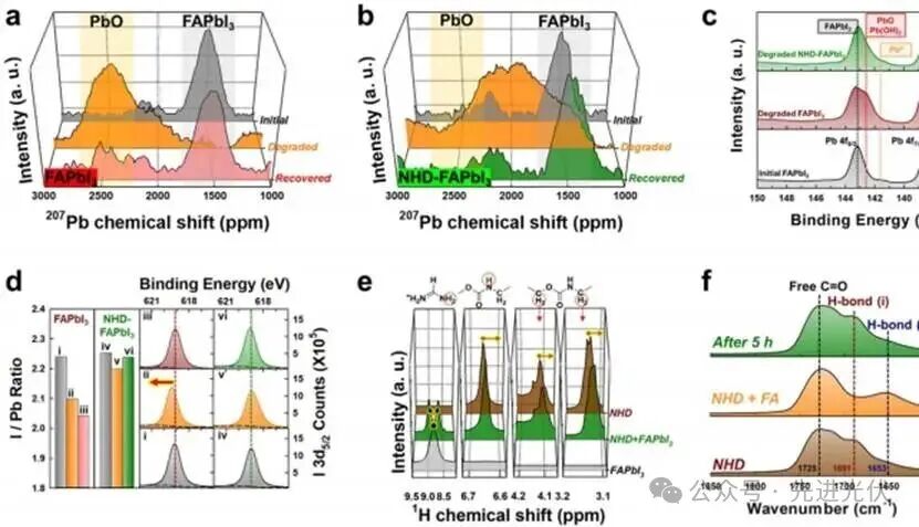 Figure 4利用固态²⁷Pb NMR、X射线光电子能谱(XPS)、溶液¹H NMR和傅里叶变换红外光谱(FT-IR)等多种化学分析技术,深入揭示了钙钛矿在自修复过程中的化学变化机制。该图展示了原始和NHD-FAPbI₃在不同状态下的Pb NMR谱图、XPS的Pb 4f和I 3d区域谱线、I/Pb比率变化、溶液NMR谱图以及FT-IR结果,突出了NHD如何通过功能团(如胺基和酯基)与Pb离子和FA分子相互作用;例如,Pb NMR显示降解NHD-FAPbI₃的化学位移较低,表明Pb与NHD配位减少了脱屏蔽效应,而XPS和NMR数据证实了氢键的形成抑制了挥发性碘化物的生成,FT-IR则展示了FA在NHD上的吸附与释放行为,这些现象共同说明了NHD作为挥发性储库,通过可逆的化学键合稳定了钙钛矿晶格,促进了降解后的高效恢复。