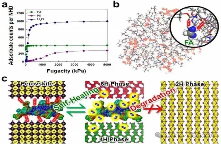 Figure 5通过分子模拟和示意图,阐明了树枝状聚合物NHD实现钙钛矿可持续自修复的机制。该图包括FA、H₂O和HI在NHD表面的吸附等温线、FA结合位点的映射及氢键相互作用细节,以及自修复过程的示意图解;模拟结果显示,NHD对FA具有高吸附容量和低扩散率(0.073 Ų·ps⁻¹),使其能稳定捕获FA分子并通过氢键将其保留,而H₂O虽吸附强但扩散快易脱附,HI则作用微弱;在机制示意图中,NHD通过胺基与Pb离子的Lewis酸碱作用稳定晶界,同时酯基捕获释放的FA,促进中间相(如4H/6H)形成,并在水分排出后引导FA重新整合回PbI₆八面体,实现晶格的可逆恢复,这一过程显著减少了氧化损伤,为PSC提供了重复自修复能力。
