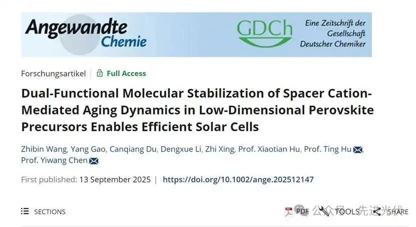 Wang, Z., Gao, Y., Du, C., Li, D., Xing, Z., Hu, X., Hu, T., Chen, Y. Dual-Functional Molecular Stabilization of Spacer Cation-Mediated Aging Dynamics in Low-Dimensional Perovskite Precursors Enables Efficient Solar Cells. Angew. Chem. Int. Ed. 2025, e202512147.https://doi.org/10.1002/anie.202512147