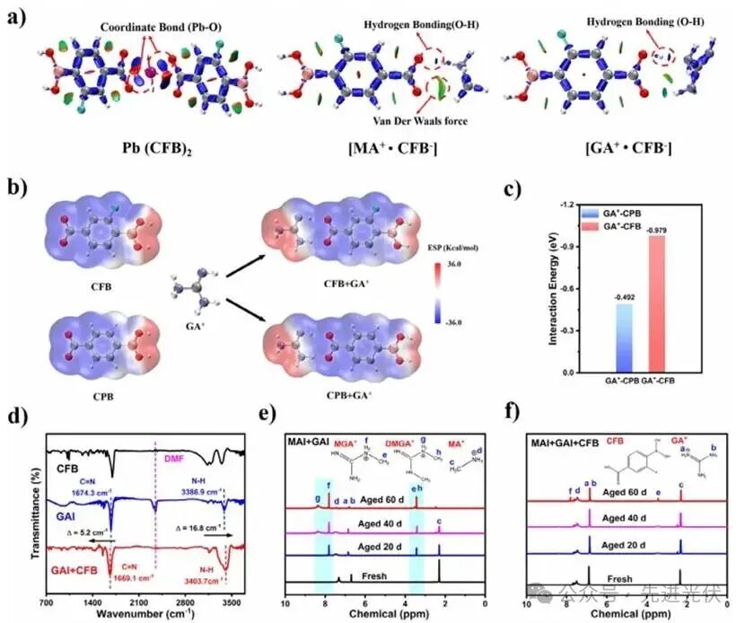 Figure 2 分析与介绍该图通过多尺度模拟与实验验证了CFB与钙钛矿组分的相互作用机制。红外成像(IRI)模拟显示CFB⁻与Pb²⁺、MA⁺、GA⁺间存在强库仑吸引(蓝色等值面),证实O-Pb配位是主要结合模式;静电势分子表面(图b)和DFT计算(图c)表明氟取代增强CFB与GA⁺的氢键强度(结合能-0.979 eV vs. CPB的-0.492 eV)。FTIR光谱(图d)中GA⁺的C=N伸缩振动红移(1643→1620 cm⁻¹)和N-H振动蓝移(3150→3180 cm⁻¹)直接证明氢键形成。¹H NMR追踪(图e,f)显示CFB显著抑制MA⁺衰减(2.30 ppm峰强度保持)及MGA⁺/DMGA⁺生成(3.43/7.81 ppm新峰减弱),定量证实其阻断老化链式反应的能力。