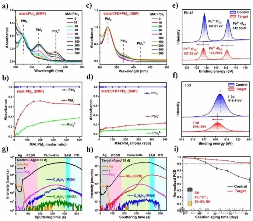Figure 3 分析与介绍此图系统研究了CFB对碘铅酸盐(PbIₙ²⁻ⁿ)形成的抑制作用及器件级影响。UV-vis光谱(图a-d)显示:未添加CFB时,随MAI/PbI₂比例增加,PbI₃⁻(370 nm)和PbI₄²⁻(420 nm)特征峰增强,预示碘氧化和I₂生成;添加CFB后两峰强度显著抑制(降幅>60%)。XPS分析(图e,f)揭示CFB引起Pb 4f结合能负移(138.5→138.1 eV)和I 3d正移(618.4→618.2 eV),证实Pb-O配位及B-I空轨道相互作用抑制碘迁移。ToF-SIMS成像(图g,h)显示CFB器件中MGA⁺/DMGA⁺信号消失,且I⁻/PbI₂迁移减少。图i的循环测试表明CFB使老化42天的前驱体制备器件仍保持90%初始效率(对照组仅剩50%)。