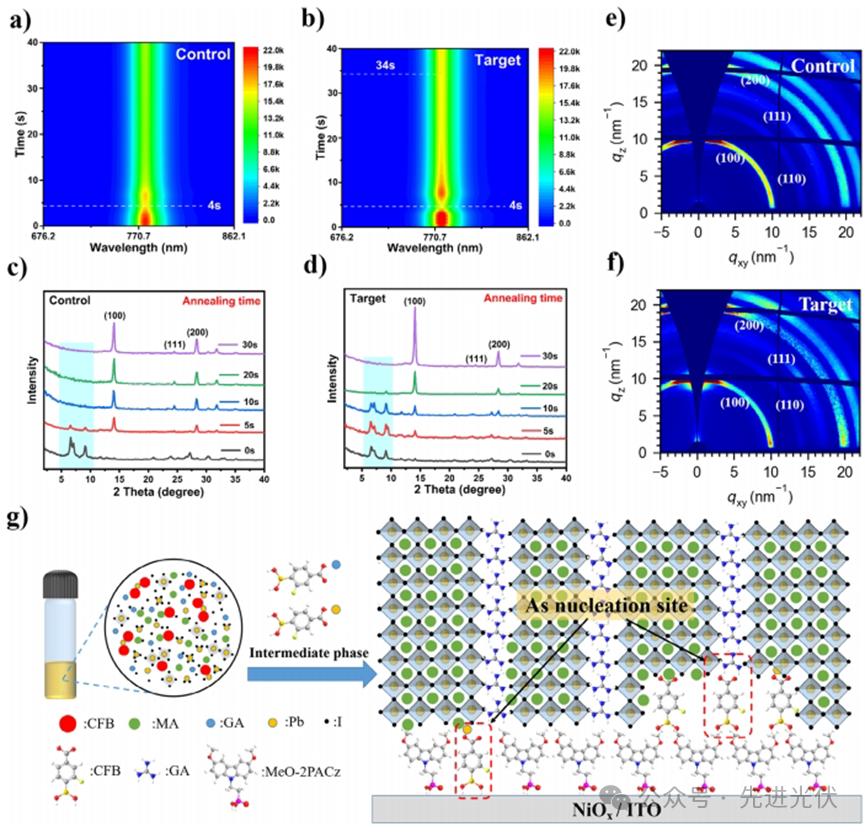Figure 5 分析与介绍此图揭示了CFB调控结晶动力学的分子机制。原位PL(图a,b)显示CFB薄膜在退火初期(20–34 s)出现诱导期,PL强度先降后升,对应中间相(CFB-PbI₂-DMF)稳定晶核形成及缺陷钝化过程。原位XRD(图c,d)捕获到CFB延长中间相寿命(>30 s vs. 对照组5 s),延缓钙钛矿相变。GIWAXS(图e,f)显示CFB增强(100)/(200)晶面衍射强度(提高2.3倍),诱导晶体沿垂直基底取向生长。示意图(图g)阐明CFB通过Pb-O配位形成模板化中间相,双向调控气-液界面成核(抑制随机生长)和基底界面外延(促进取向附着),最终获得高取向晶粒。