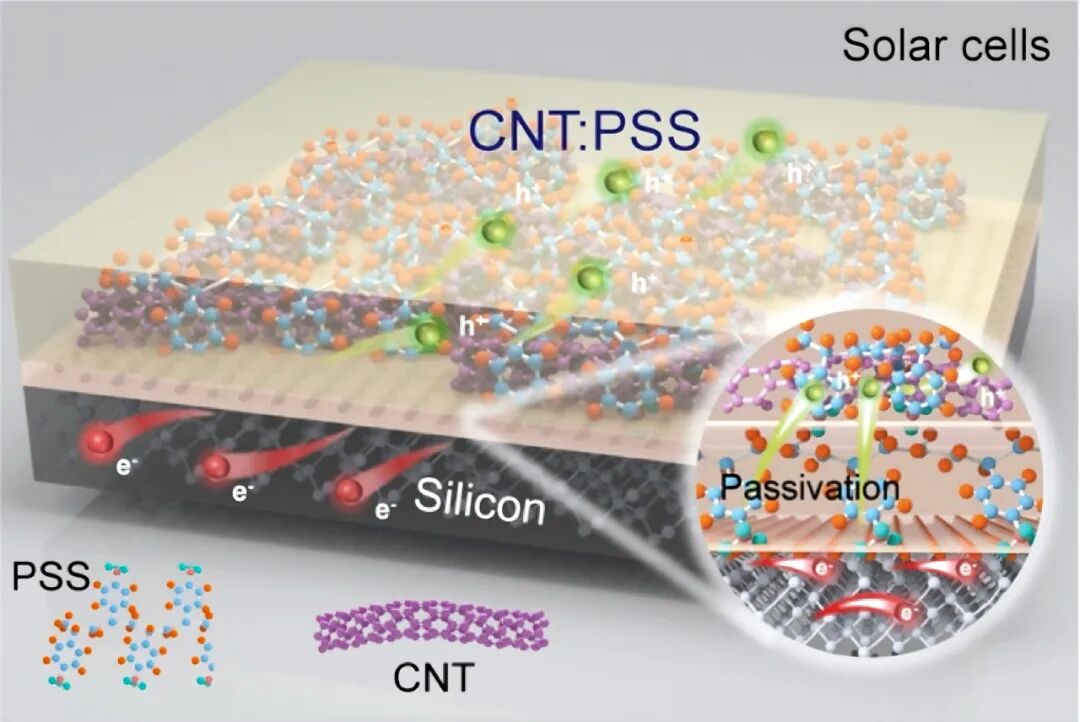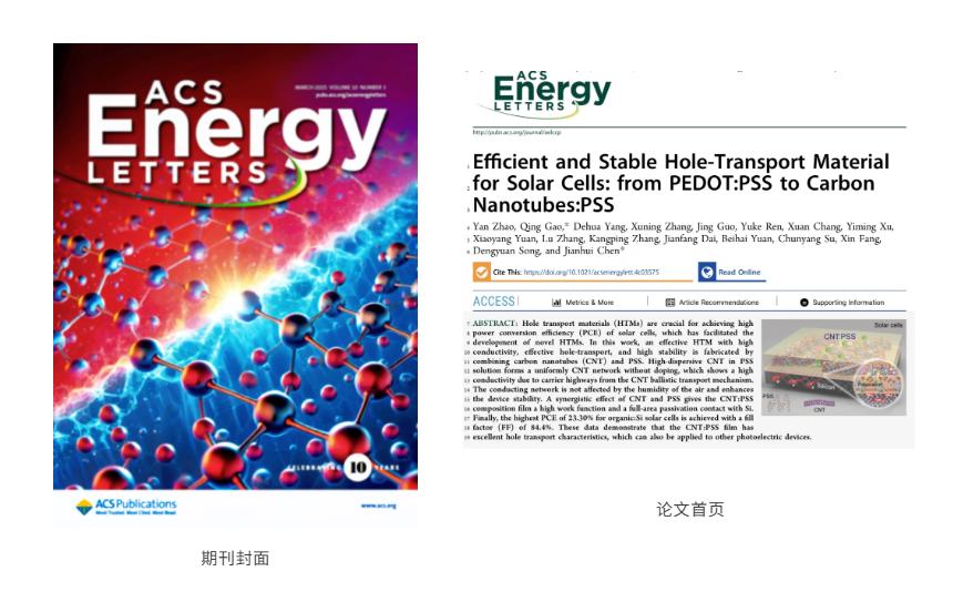近日,一道新能携手河北大学首次研发成功高效高稳定的硅基碳纳米管新型太阳电池,命名为CNT:PSS/Si,研究成果《Efficient and Stable Hole-Transport Material for Solar Cells: from PEDOT:PSS to Carbon Nanotubes:PSS》发表于国际能源领域最具影响力的顶级学术期刊《ACS Energy Letters》(该期刊影响因子19.3)。CNT:PSS/Si电池具有制备温度低、工艺简单、效率高、成本低的特点,同时CNT:PSS钝化接触材料可广泛应用于新型太阳电池、钙钛矿以及钙钛矿/Si叠层光伏电池的效率提升,为新型太阳电池的研发提供了全新的材料选择、技术路径与研究思路。