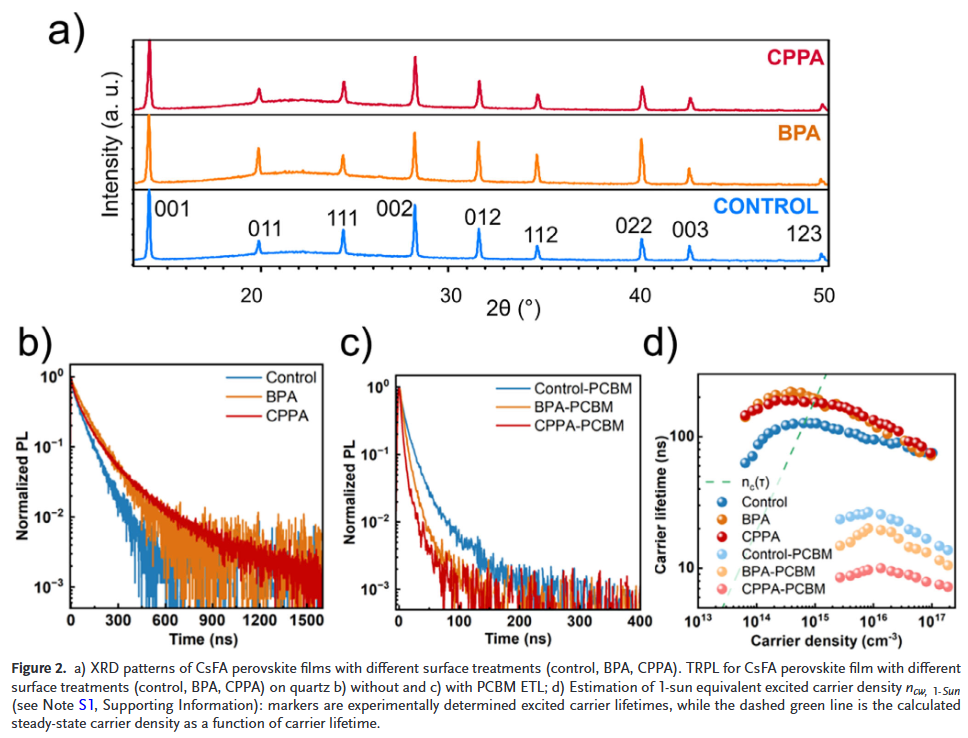 该中间层可通过其膦酸基团与钙钛矿表面缺陷发生相互作用实现钝化,同时分子的富勒烯部分与PCBM相互作用确保高效电荷传输。使用4-(1',5'-二氢-1'-甲基-2'H-[5,6]富勒烯-C60-lh-[1,9-c]吡咯-2'-基)苯基膦酸(CPPA)作为中间层,可显著缩短载流子寿命,表明电荷提取得到改善,从而使CsFA(从22.8%提升至24.6%)和CsFAMA(从22.1%提升至25.1%)PSCs的功率转换效率(PCE)显著增强。观察到的改善可归因于CPPA分子中膦酸和富勒烯的协同效应,因为苄基膦酸(BPA)界面层对载流子寿命和器件性能的改变要小得多。