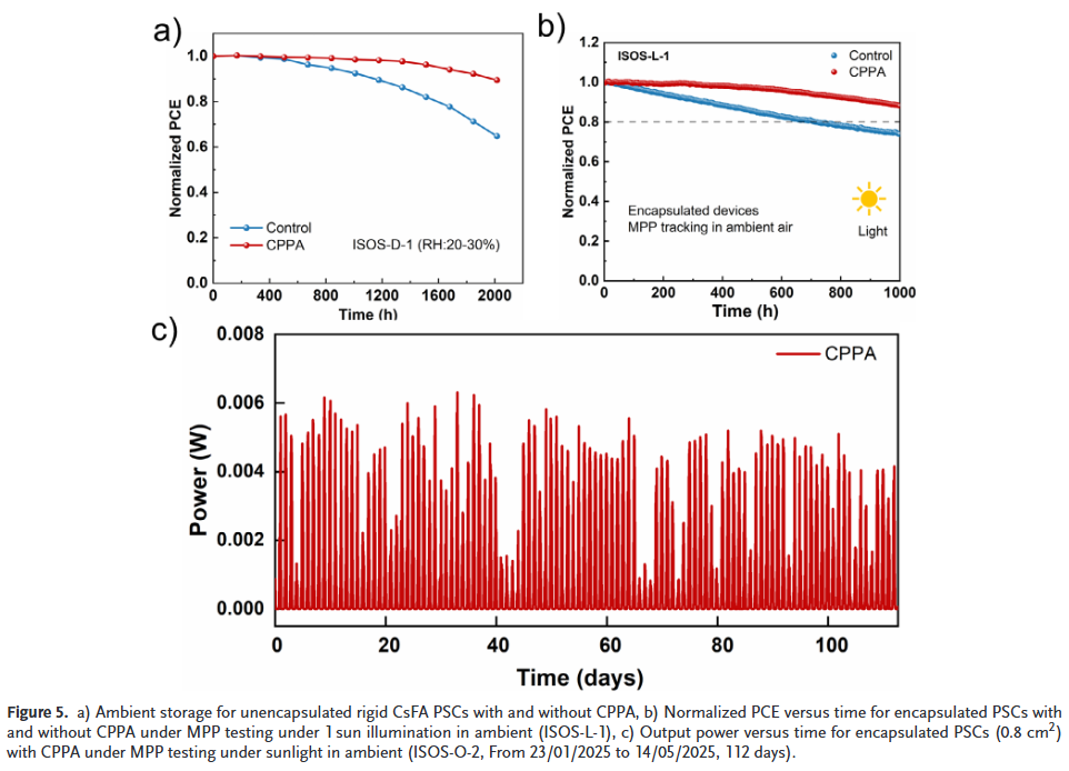 CPPA中间层还增强了器件的稳定性,含CPPA的未封装器件在黑暗环境空气中存放2000小时后仍保持90%的初始PCE,而封装器件在1个太阳光照下进行1000小时最大功率点(MPP)测试后保持89%的初始效率,并在环境阳光下户外测试112天表现出稳定的性能。
