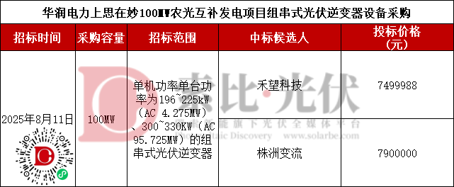 9月17日,华润电力上思在妙100MW农光互补发电项目-组串式光伏逆变器设备采购中标候选人公示,项目建设地点在广西壮族自治区防城港市上思县。