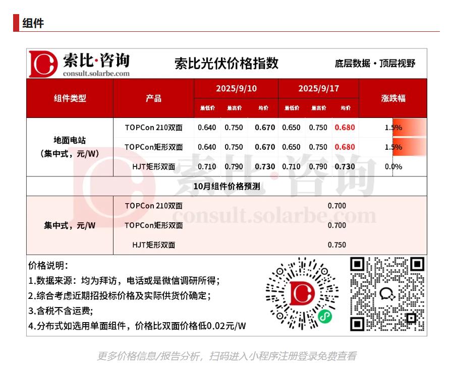 本周组件价格上涨。地面电站TOPCon210双面0.680元/W,TOPCon矩形双面0.680元/W,HJT矩形双面0.730元/W。