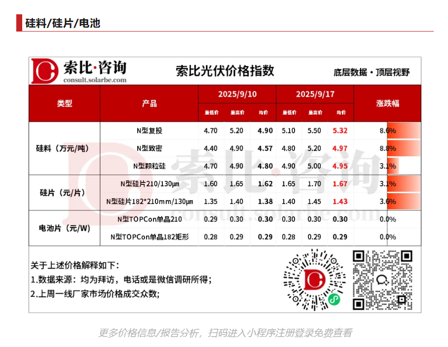 供需方面,9月国内多家专业化硅片企业提产,整体产出较8月呈上升趋势。虽然硅片由去库转入小幅累库,但目前整体库存仍处于合理水平,这对价格形成一定支撑。多晶硅料价格持续上涨并保持坚挺,直接推高了硅片的生产成本。硅片价格在过去一周呈现普涨态势,主要受上游成本推动,但未来一周预计将进入高位震荡阶段,进一步上涨空间有限。