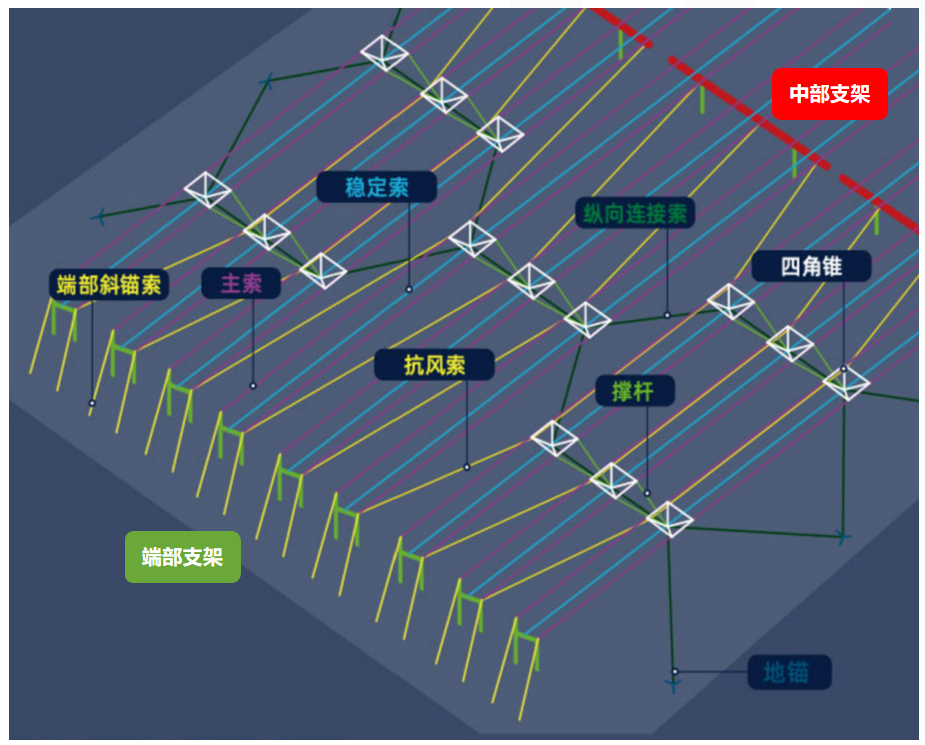在工商业应用场景中,厂区设施密集、人员流动频繁、经济活动复杂,对光伏支架系统的安全稳定性提出了极高要求。HYPSET柔性支架系统创新采用预应力空间索网结构,通过"刚柔并济"的设计理念,实现了结构安全性的重大突破。