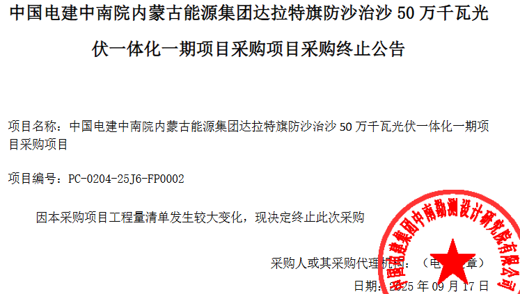 9月17日,中国电建中南院内蒙古能源集团达拉特旗防沙治沙50万千瓦光伏一体化一期项目采购项目终止公告发布。