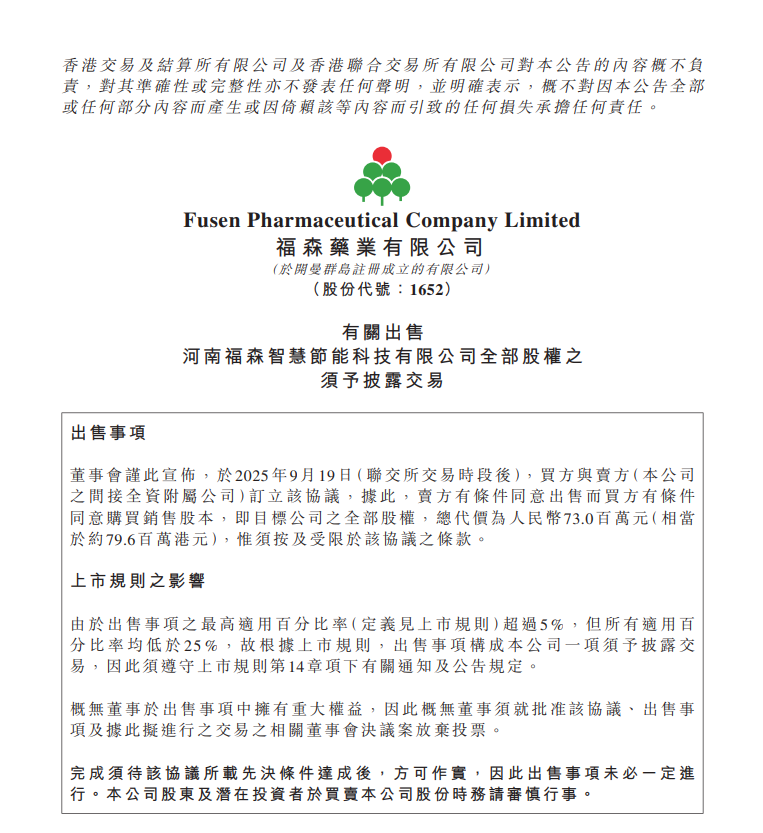 买方河南淅胜产业发展有限责任公司与卖方河南福森药业有限公司(公司间接全资附属公司)订立该协议,据此,卖方有条件同意出售而买方有条件同意购买销售股本,即目标公司河南福森智慧节能科技有限公司的全部股权,总代价为人民币7300万元。