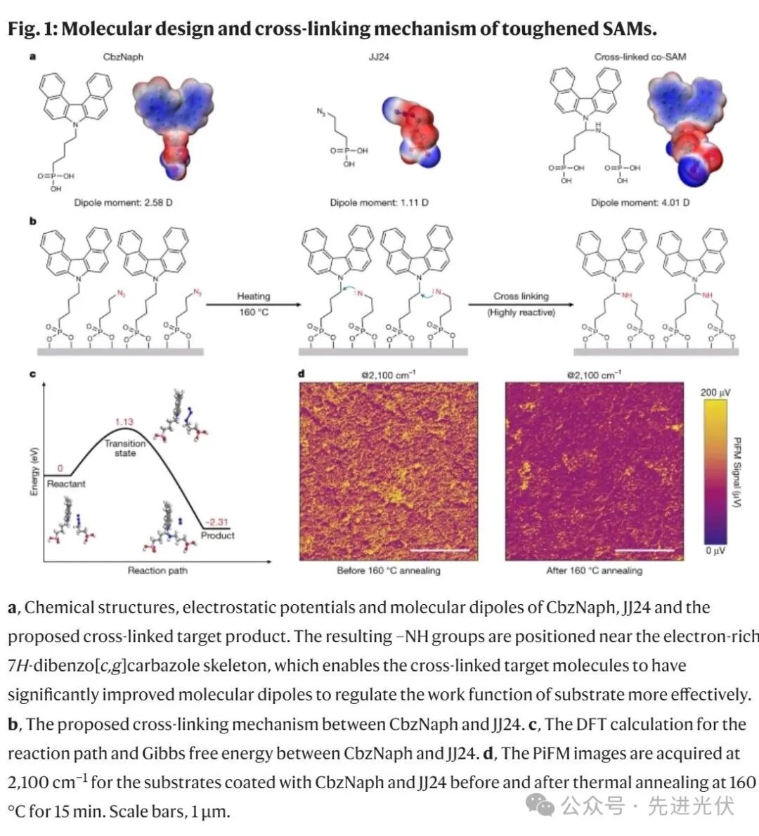 交联型自组装单分子层(SAM)分子JJ24具有一个叠氮基团、一个丙基连接器和一个磷酸锚定基团。尽管有机叠氮化合物可能存在安全隐患,JJ24符合安全标准(六规则)并在长期储存过程中保持相对稳定。通过热激活,叠氮基团转化为氮烯,使JJ24能够与宿主分子CbzNaph的烷基连接器共价交联。JJ24上的磷酸基团使其可以与常见的基于磷酸的SAM分子共沉积,因为它们具有相似的pKa值。JJ24的线性丙基连接器设计比宿主分子CbzNaph的丁基连接器要短,这样不仅能够填充空隙,还能增强SAM分子之间的范德华相互作用,同时确保氮烯与CbzNaph头基旁边的sp3碳原子发生理想的拓扑交联。热重分析显示,叠氮分解的起始温度为148°C,这是叠氮释放氮气形成氮烯的温度。密度泛函理论(DFT)计算确认了该反应的吉布斯自由能为-2.31 eV,具有适中的能量屏障(1.13 eV)。重要的是,交联后的共自组装单分子层(co-SAM)表现出增强的分子偶极矩(4.01 D,相较于原始CbzNaph的2.58 D),能够有效调节基底的功函数。