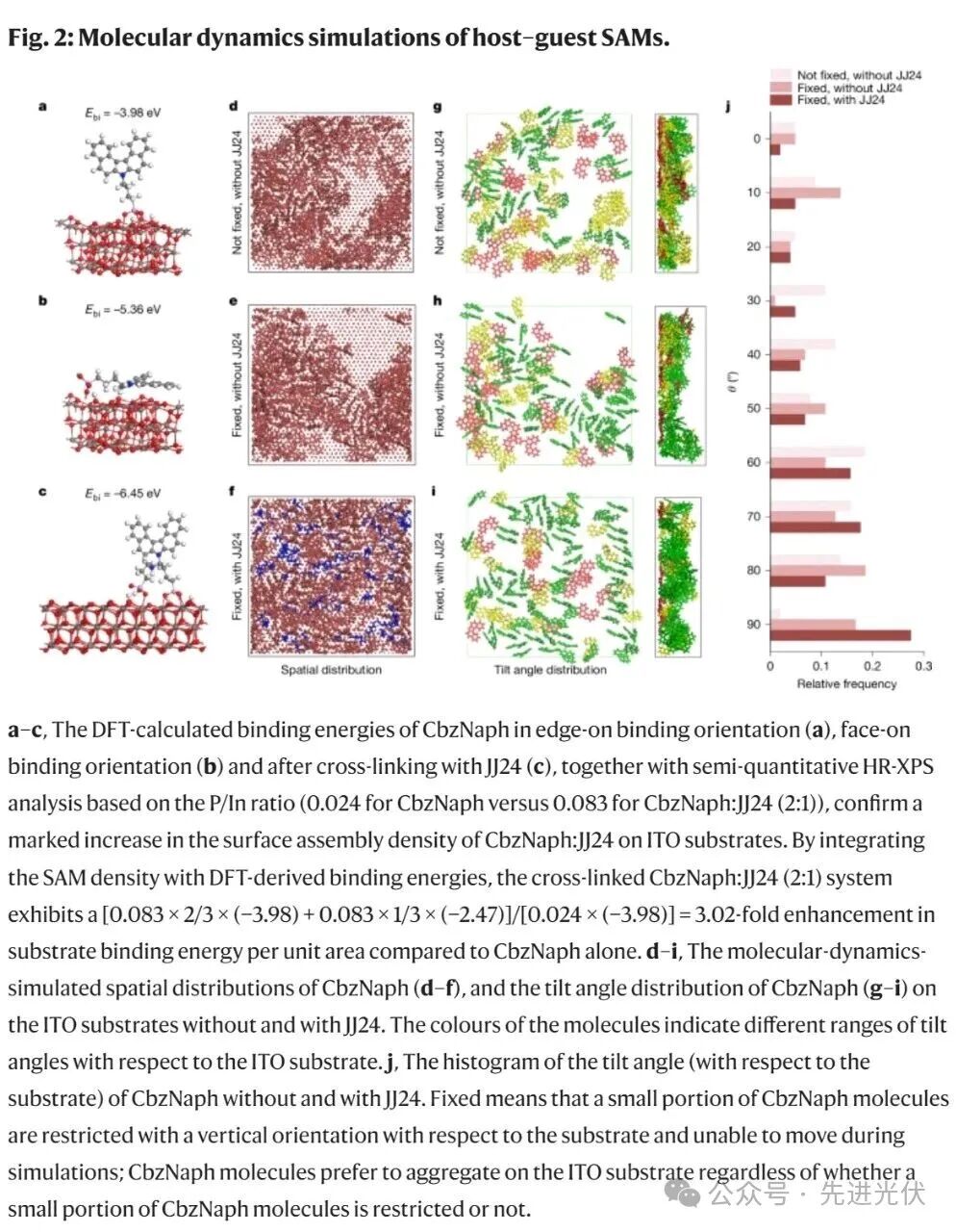 基于密度泛函理论(DFT)计算和分子动力学模拟,我们系统地研究了引入的JJ24如何影响CbzNaph分子在ITO基底上的组装。DFT计算表明,CbzNaph分子倾向于以平面朝上的方式吸附在ITO上,这是由于其灵活的烷基链和与ITO的较低结合能(平面朝上的结合能为−3.98 eV,而边缘朝上的结合能为−5.36 eV)。相比之下,交联后的SAMs在边缘朝上的吸附方式下展现出更强的结合能(−6.45 eV),使这一取向在能量上更为有利。分子动力学模拟有助于可视化这一转变,展示了交联后分子从平躺排列转变为直立排列的过程。除了优化分子取向,JJ24的引入为SAM提供了额外的锚定点,从而显著增强了基底的粘附力。结合HR-XPS测量得到的P/In比值,我们估算交联后的SAM的结合能相比原始SAM增加了3.02倍,显著提高了其对物理应力和极性溶剂的抵抗能力。此外,分子动力学模拟显示,无论初始锚定条件如何,原始的CbzNaph分子倾向于形成不完全的SAM覆盖层,这使得钙钛矿与ITO之间直接接触,进而增加了电荷重组和钙钛矿的降解。令人鼓舞的是,JJ24的引入促进了SAM分子的均匀分布,交联后的SAM分子的倾斜角度增大,从而提高了SAM的整体质量。X射线反射率测量表明,单分子层厚度从原始CbzNaph的0.72 nm(约60°倾斜角)增加到交联后的共SAM的1.32 nm(约24°倾斜角),验证了JJ24促进分子更垂直排列的能力。该现象还得到了质子NMR的支持,NMR数据显示选择性交联发生在特定分子位点。