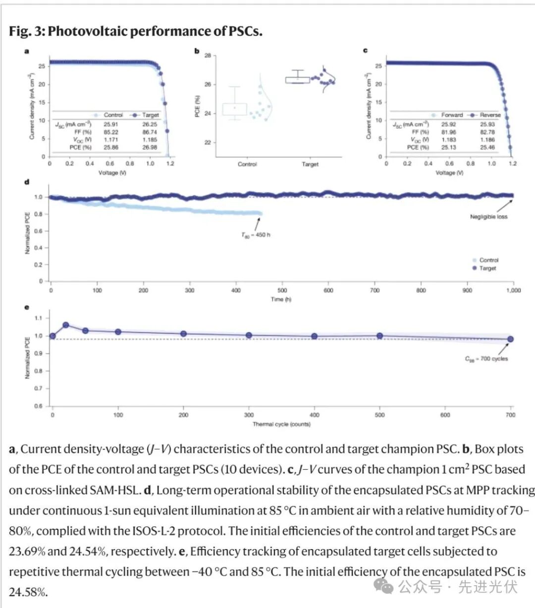 本研究报告了一种前所未有的交联共SAM策略,该策略能够改善SAM分子的分散性及在透明导电氧化物(TCO)基底上更密集组装的构象稳定性;这一方法提升了器件在严苛外部应力下的性能和稳定性。采用这种增强型孔选择层的倒置钙钛矿太阳能电池(PSCs)实现了26.92%的优异认证光电转换效率(PCE)。更重要的是,封装后的器件在85 °C、70-80%相对湿度下进行1,000小时的最大功率点跟踪(MPP)后,初始效率几乎没有衰减。此外,在经历了700次-40 °C至85 °C之间的反复热循环后,器件能够保持超过98%的初始PCE。这代表了倒置PSCs在加速老化条件下,结合高效率和操作稳定性的最佳报道结果之一。该研究为开发高性能和稳定的基于SAM的倒置PSCs提供了重要的见解,推动其潜在商业化进程,并为其他采用高粗糙度基底的SAM设备提供了解决方案,以扩大其应用范围。