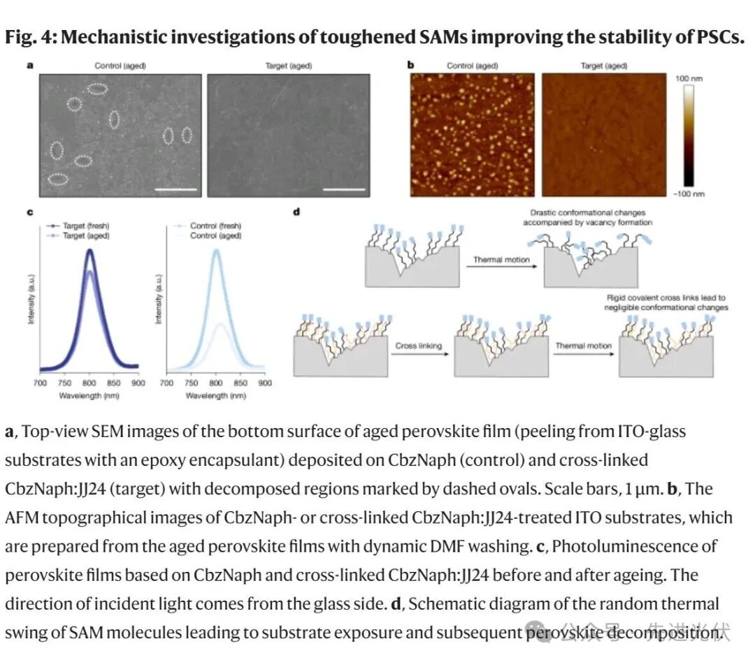 交联共SAM提升稳定性:通过采用可交联的共SAM,增强了孔选择性SAM在外部应力下的构象稳定性,有效防止了SAM自组装过程中出现缺陷和空隙,从而提高了器件的长期稳定性。