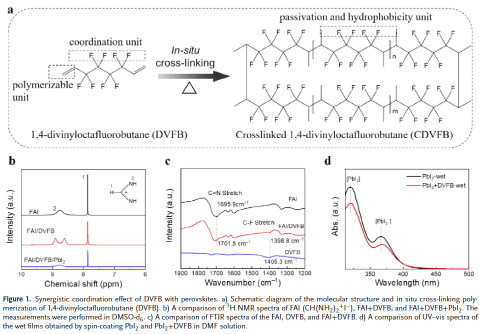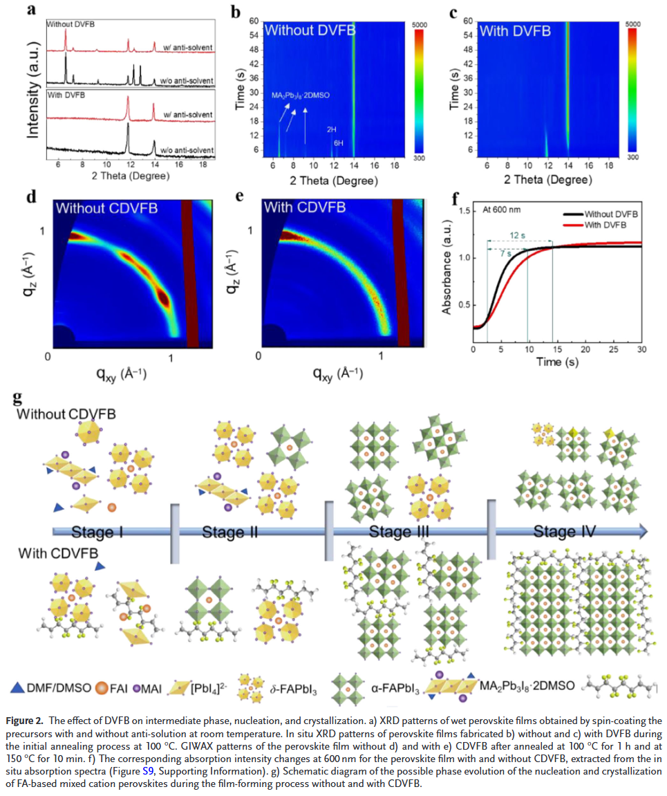 - 含氟超支化聚合物(CDVFB)精准调控结晶路径:通过单体DVFB的热聚合,在钙钛矿成膜过程中协同配位FAI和PbI₂,有效抑制了溶剂中间相的形成,将复杂的多步相变(溶剂相+2H+6H→α相)简化为直接的2H→α相转变,获得了高结晶度、高相纯度且(100)面择优取向的钙钛矿薄膜。