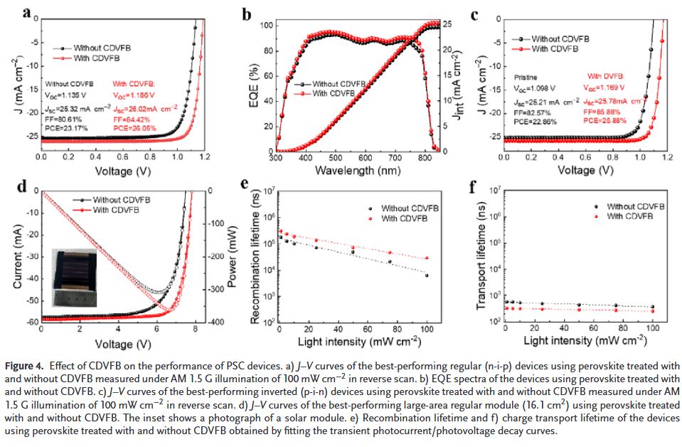 - 器件效率与大面积制备能力显著提升:基于CDVFB的常规(n-i-p)和倒置(p-i-n)结构小面积电池效率分别达到26.05%和25.88%;大面积组件(16.1 cm²)效率达到22.43%,展现了优异的规模化应用潜力。