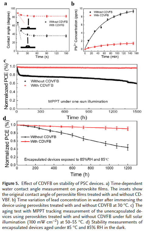 - 卓越的环境稳定性与铅泄露抑制:CDVFB的交联疏水网络极大提升了薄膜的耐水性(接触角保持>82°),未封装器件在1500小时持续光照MPPT测试后效率保持率高达97%,并能有效抑制85%以上的铅离子泄露,兼具高性能与高环境安全性。