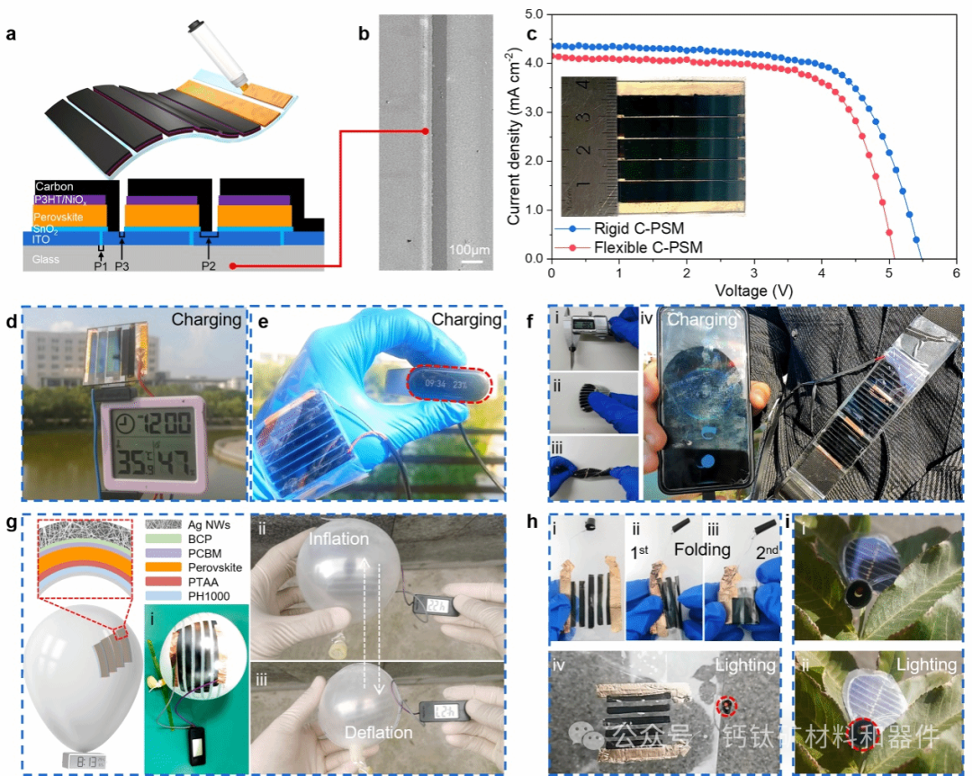 溶液法制备的钙钛矿太阳能电池是低成本、轻量化及可穿戴电源的潜力之选,其制备工艺的便携性、可扩展性与图案化能力是应用推广与落地的关键。在此,谭付瑞教授团队提出了一种基于马克笔的大面积、可图案化、可循环钙钛矿薄膜书写技术。通过调控墨水浓度、书写压力、移动速度及笔尖宽度,结合马克笔的纤维毛细结构,实现了对钙钛矿胶体尺寸的均质化、薄膜厚度(200至>1000 nm)及图案面积(1至100+ cm²)的有效控制;进一步通过溶剂工程设计,可在常温环境下直接书写出结晶钙钛矿薄膜。基于上述无掩模、无激光工艺制作的马克笔书写碳电极钙钛矿太阳能组件,在刚性基底和柔性基底上分别实现了16.3%和14.5%的光电转换效率。该方法也为在不同物体表面(包括弹性气球,玻璃纸等)快速现场制备轻质、柔性可穿戴电源及异形光伏器件提供了新途径。