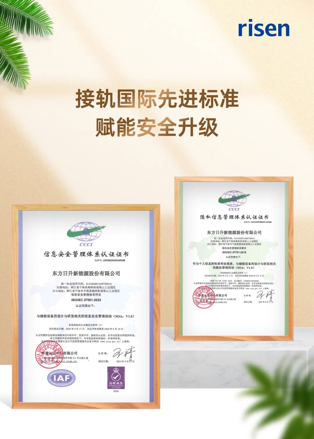 通过这两项权威认证,东方日升向全球客户、合作伙伴及监管机构展示了公司在信息安全与隐私保护方面的专业能力与坚定承诺。这不仅为公司的数字化转型与全球化业务布局提供了坚实保障,也进一步强化了东方日升在国际市场的可信度和竞争力。