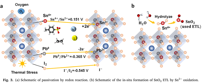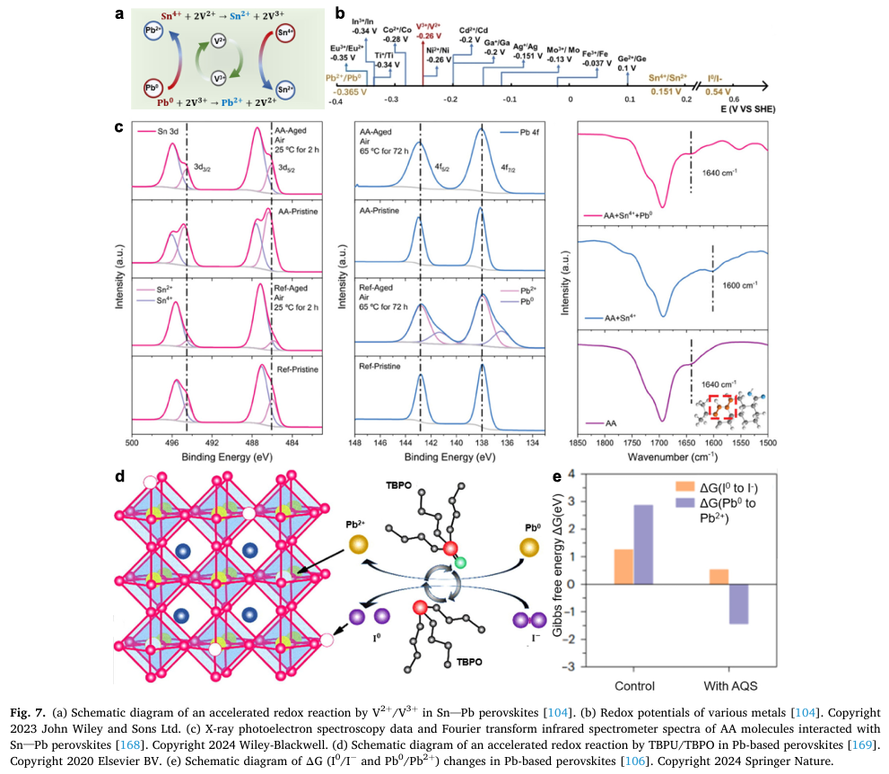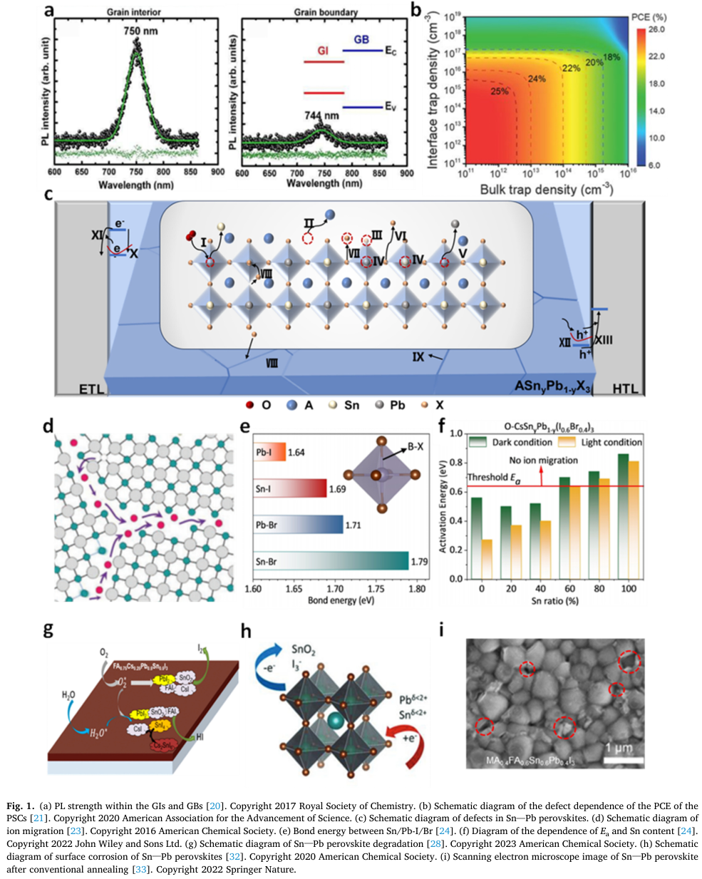 - 系统解析Sn–Pb钙钛矿界面缺陷类型与形成机制:重点分析了Sn空位、Sn⁴⁺氧化缺陷、A位离子质子化缺陷等,揭示了Sn/Pb竞争结晶导致的组分不均匀性是缺陷主因。