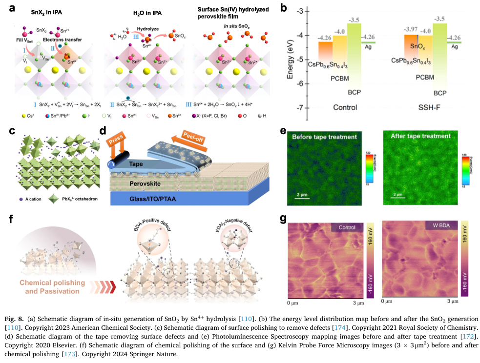 - 全面综述钝化策略与机制:涵盖配位键、氢键、离子键等化学键合策略,以及氧化还原反应、表面化学/机械抛光等新型钝化方法,提供了多角度缺陷修复路径。