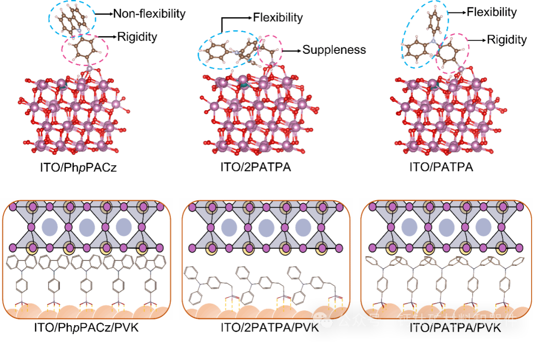 在前期工作基础上(Angew. Chem. Int. Ed. 2025, 64, e202424910; Adv. Funct. Mater. 2025, 35, 2424259)。近日,河南大学陈石团队在《Nature Communications》期刊发表题为“Flexibility meets rigidity: a self-assembled monolayer materials strategy for perovskite solar cells”的研究论文。该研究提出了一种SAM材料协同设计策略,通过结合柔性头部基团与刚性连接基团来实现这一目标。以(4-(二苯氨基)苯基)膦酸(PATPA)为模型分子,与传统材料(4-(9H-咔唑-9-基)苯基)膦酸(PhpPACz)和(4-(二苯氨基)苯乙基)膦酸(2PATPA)相比,该材料上能够生长高质量的钙钛矿层,进而实现了精准的能级对齐,提升了空穴提取效率,增强了电荷传输效率,有效降低了非辐射电荷复合。最终,以PATPA为空穴传输层,电池在小面积(0.0715 cm²)和大面积(1 cm²)上能量转换效率分别为26.21%和24.49%。该电池器件在连续光照1000小时后保持91%初始效率,在85°C加热500小时后保持88%初始效率。该研究为开发高效稳定SAM材料提供了重要指导,对钙钛矿光伏技术发展具有重要意义。