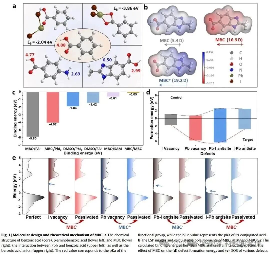 1.结合DFT计算和布朗斯特酸碱理论,理性设计并合成了一种两性共面共轭分子(MBC)。该分子中的咪唑基团赋予其合适的碱性,同时通过吸电子效应增强了苯甲酸的酸性,使其能以分子内盐和羧酸根阴离子等多种形式共存,从而可同时钝化钙钛矿中多种带电缺陷并调控结晶动力学。