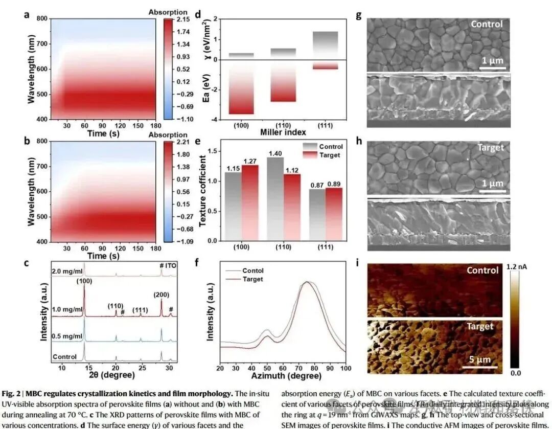 图2通过多种原位和离线表征技术,揭示了MBC对钙钛矿结晶过程、晶体取向和最终薄膜形貌的深刻影响。图2a和2b的原位紫外-可见吸收光谱对比显示,添加MBC后钙钛矿薄膜的结晶速率显著减慢(从33秒延长至79秒),表明MBC通过与前驱体的强相互作用延缓了结晶过程。图2c的XRD图谱显示MBC提高了所有晶面的衍射强度。图2d的计算表明MBC在(100)晶面具有最高的吸附能,这解释了图2e中纹理系数计算显示的(100)晶面择优生长现象。图2f的GIWAXS径向积分强度图表明,目标样品在 azimuth angle 50°处的强度降低,说明其晶体更倾向于面外方向生长。图2g和2h的SEM图像直观展示了MBC带来的晶粒增大(从317nm增至405nm)和埋底界面孔洞的消除。图2i的c-AFM结果证实目标样品具有更高的平均表面隧穿电流(0.152 nA → 0.313 nA),证明了其增强的薄膜导电性。