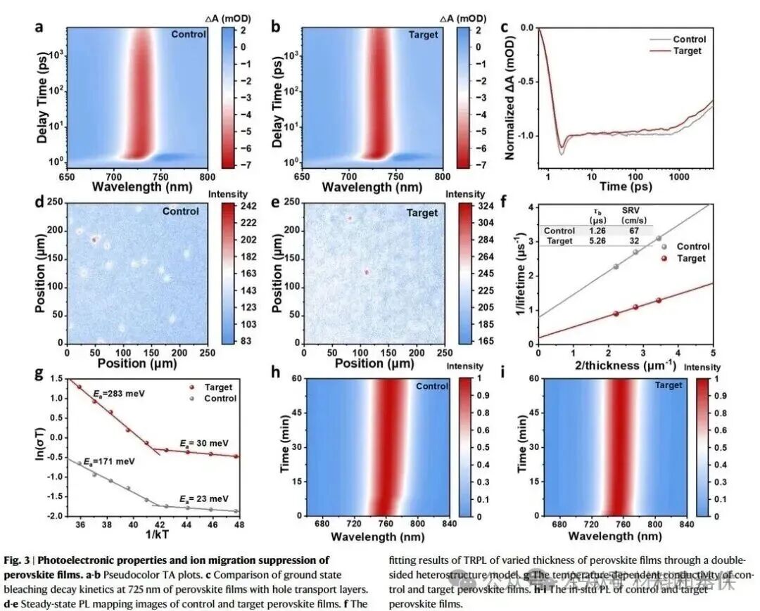 图3通过一系列先进的光电表征手段,系统评估了MBC对钙钛矿薄膜载流子动力学、复合行为及离子迁移的抑制效果。图3a和3b的瞬态吸收(TA)谱图显示,目标样品在725nm处的基态漂白(GSB)信号衰减更快(图3c),表明其空穴从钙钛矿到空穴传输层的提取过程得到增强,这归因于MBC与SAM分子间的π-π堆积作用。图3d和3e的稳态PL mapping显示目标样品的荧光分布更均匀,强度更高,表明其非辐射复合被有效抑制,费米能级分裂程度更大。图3f通过变厚度TRPL拟合的双异质结模型分析,定量得出目标样品的体寿命(1.26 μs → 5.26 μs)显著延长,表面复合速度(SRV, 67 cm/s → 32 cm/s)显著降低,证实了MBC对体相和界面缺陷的双重钝化效果。图3g通过变温电导测试计算出目标样品的离子迁移激活能(Ea)从171 meV显著提升至283 meV,迁移速率(r)从9.10×10¹⁰ s⁻¹降至1.63×10⁹ s⁻¹,直接证明了MBC对卤化物离子迁移的强大抑制能力。图3h和3i的原位PL监测进一步显示,目标样品在光照60分钟后荧光峰位红移和展宽程度远小于对照组,验证了其相分离趋势被有效抑制。