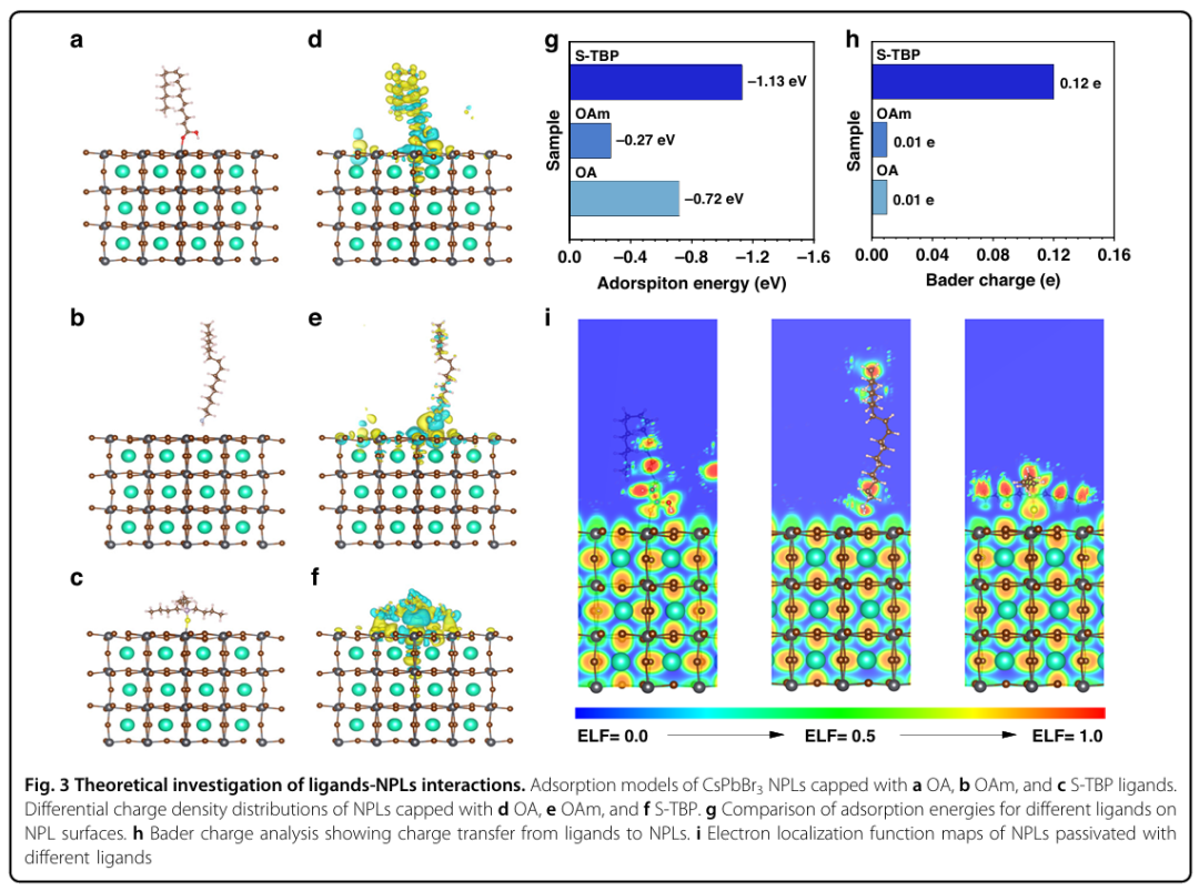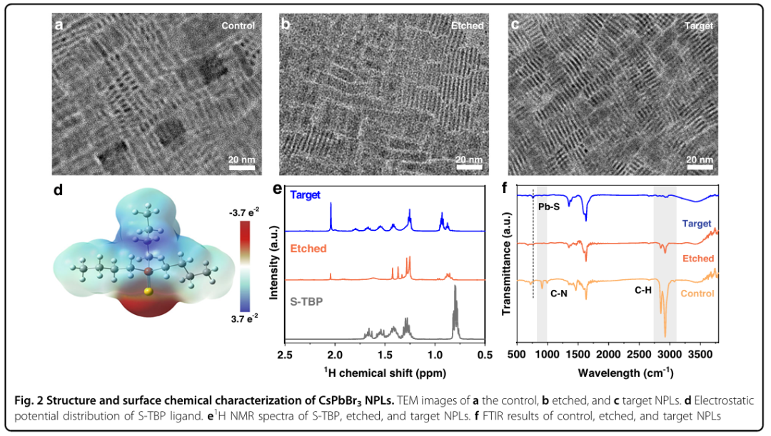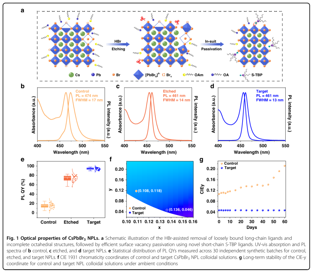 - 酸辅助配体钝化策略:通过HBr酸蚀结合S-TBP短链配体,形成强Pb–S–P配位键,显著提升纳米片表面稳定性,抑制堆叠导致的发射红移。