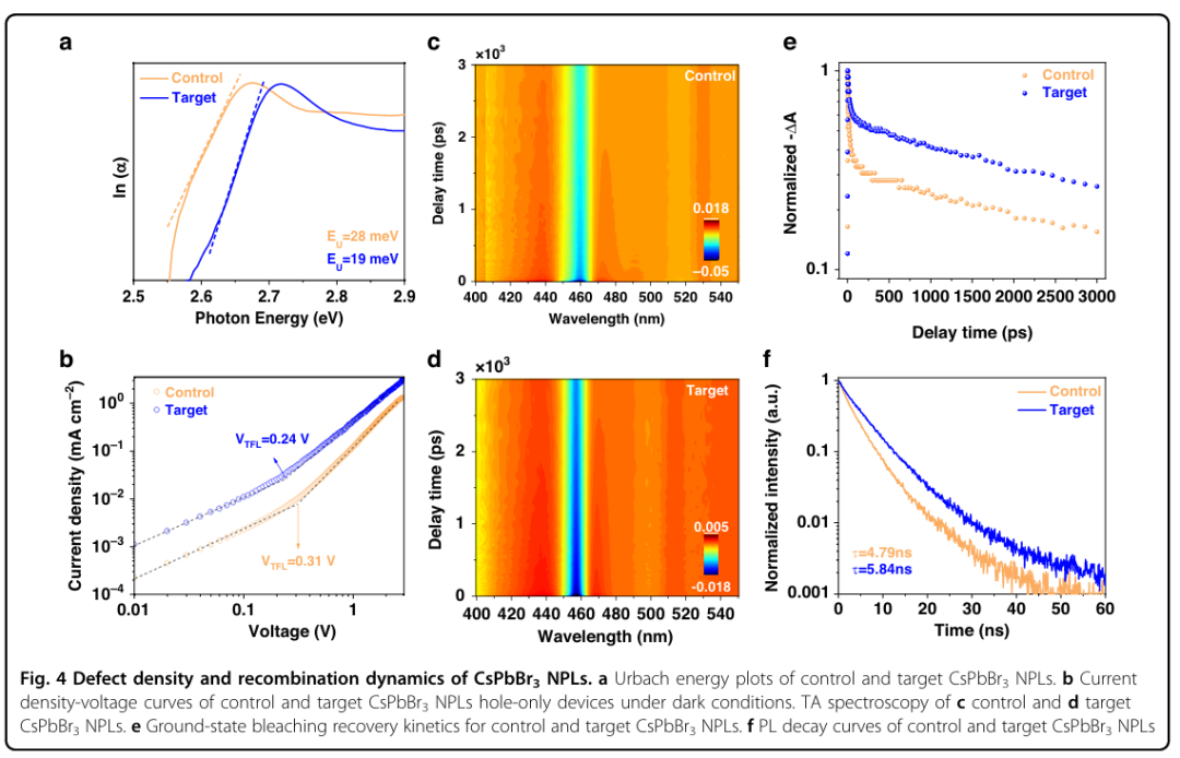 - 器件性能突破:PeLED外量子效率达6.81%,亮度143 cd/m²,为当前纳米片基深蓝PeLED最高水平,具备良好的光谱稳定性与商业化潜力。