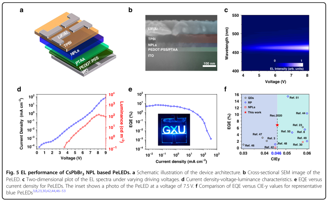 Song, Y., Cao, S., Wang, Y. et al. Efficient deep-blue LEDs based on colloidal CsPbBr3 nanoplatelets meeting the Rec.2020 standard. Light Sci Appl 14, 336 (2025).