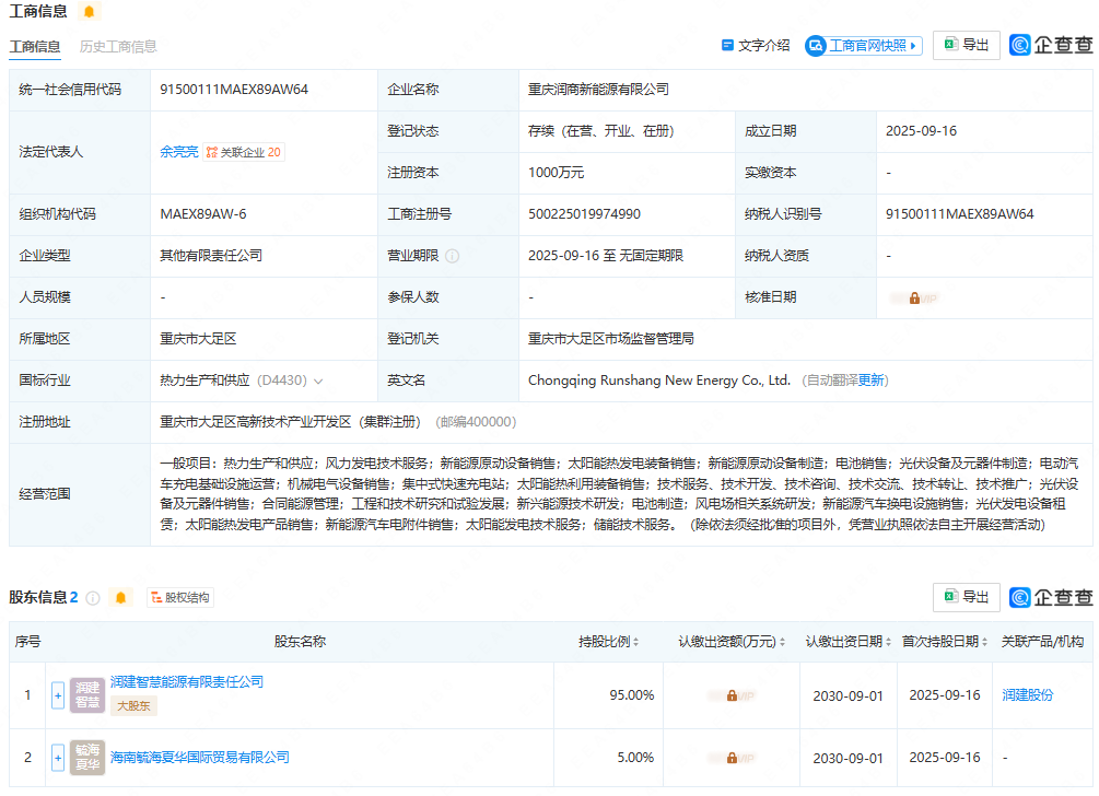 近日,重庆润商新能源有限公司成立,法定代表人为余亮亮,注册资本为1000万元。