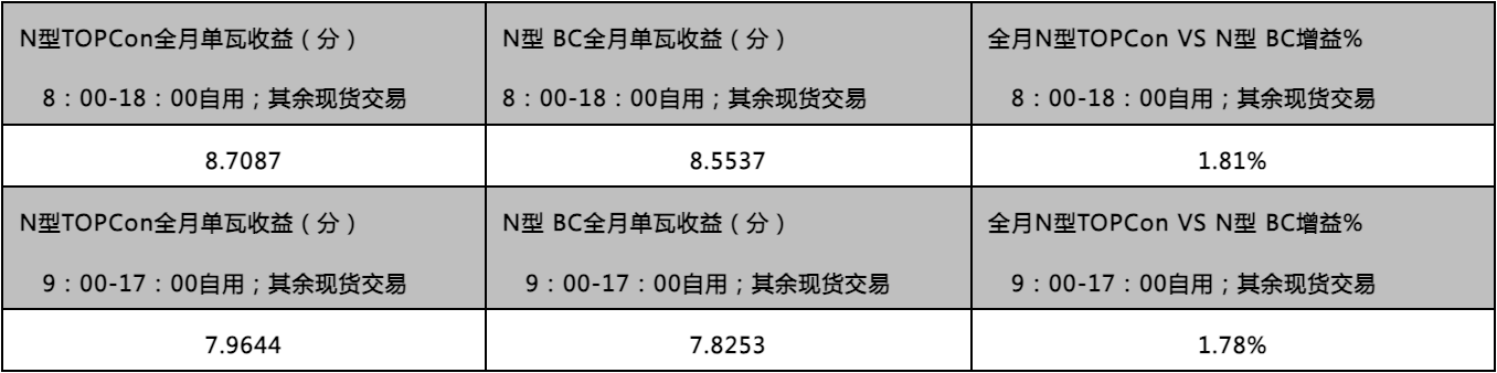 除了自发自用,进入现货市场晶科N型Tiger Neo组件也具备优势。若假设上述电站8:00-18:00全部自发自用,剩余时段电力全额上网参与现货,N型TOPCon组件较N型BC组件单瓦收益增益1.81%。若9:00-17:00全部自发自用时,剩余时段电力全额上网参与现货,N型TOPCon组件较N型BC组件单瓦收益增益1.78%。