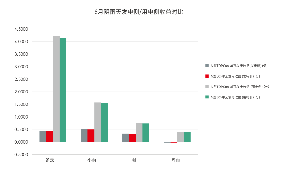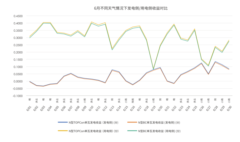 据气象数据显示,6月整月,山东烟台当地有23天处于多云、小雨、阴天、阵雨天气环境中,其中5:00~20:00时间段内,400W/㎡以下辐照时间占比70%左右。通过综合对比6月所有阴雨天的电站收益,TOPCon组件的弱光性能优势显著,经测算结果显示:N型TOPCon组件较N型BC组件发电侧单瓦增益2.49%,用电测单瓦增益2.01%。