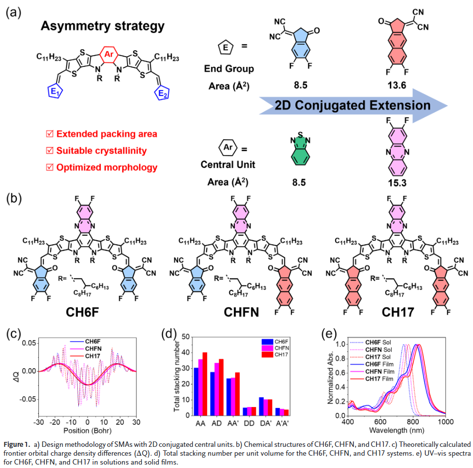 - 不对称设计优化分子堆积:通过将对称受体中的一个端基替换为更大共轭的NC-2F单元,构建不对称受体CHFN,有效平衡了端基与中心单元的堆积强度,提升结晶性与膜态形貌。